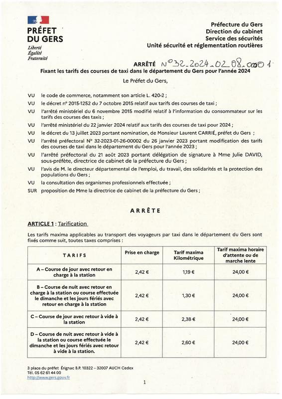 ArrêTé Fixant Les Tarifs Des Courses De Taxi 2024 Dans Le Gers