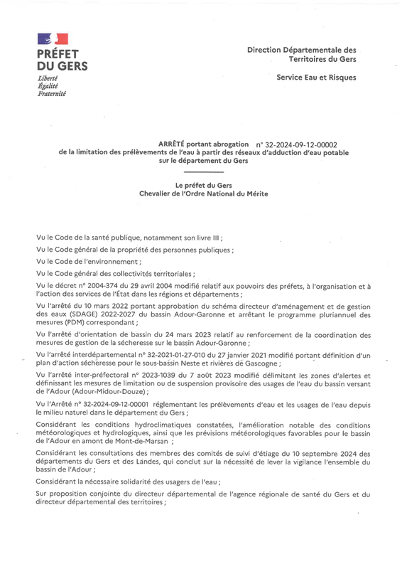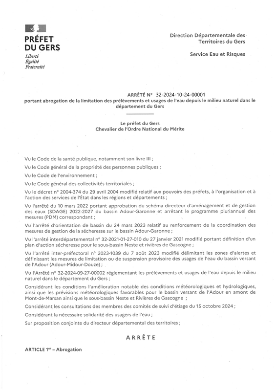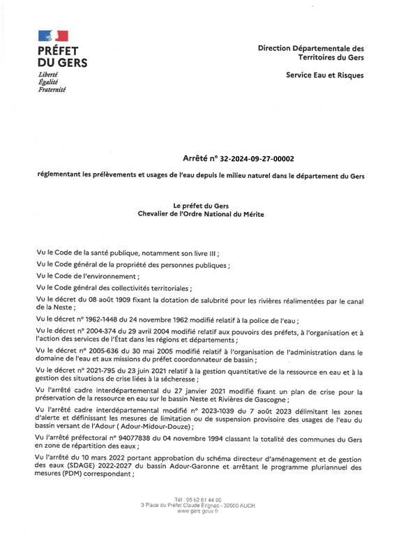 Ap N° 32 2024 10 24 00001 Portant Abrogation Des PréLèVements&Usages Milieun Dans Le Gers